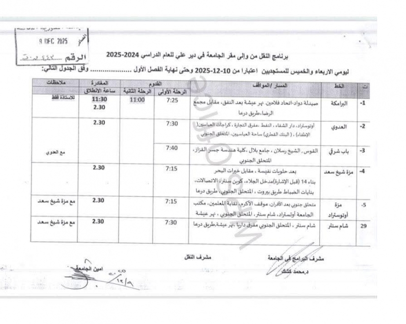 برنامج النقل من وإلى الجامعة في دير علي كل أربعاء وخميس للطلبة المستجدين اعتباراً من ١٠/١٢/٢٠٢٥ ولغاية نهاية الفصل الدراسي الأول
