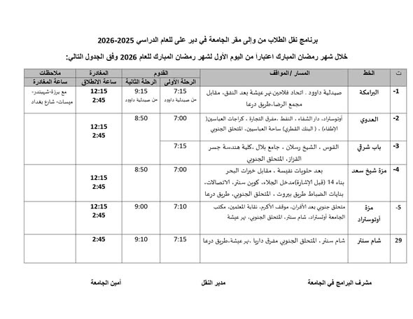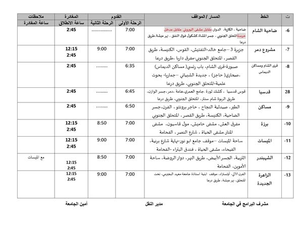 يحدد دوام الجامعة السورية الخاصة في شهر رمضان المبارك من الساعة 8:00 صباحاً وحتى الساعة 2:45... بناءً عليه تم وضع برنامج النقل.