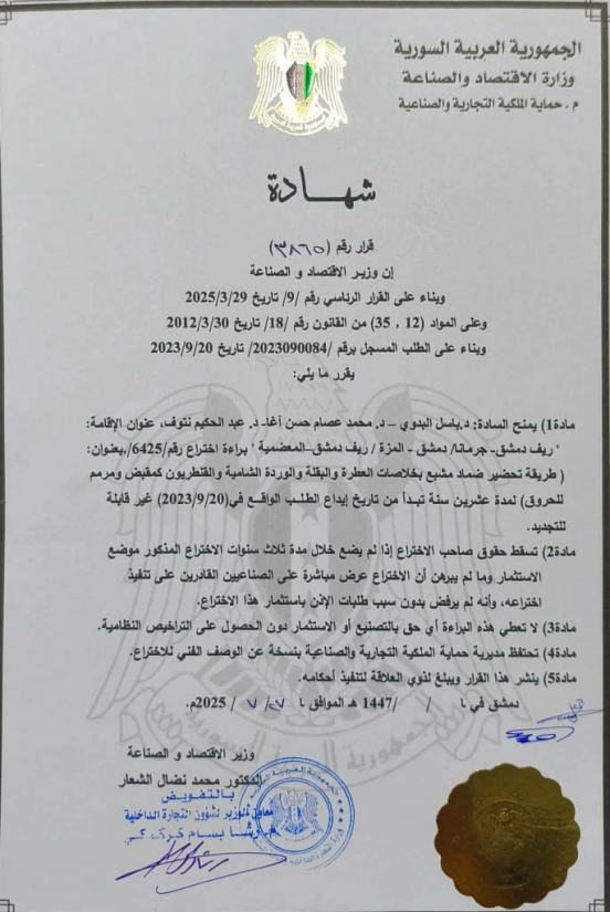 براءة اختراع بعنوان "طريقة تحضير ضماد مشبع بخلاصات العطرة والبقلة والوردة الشامية والقنطريون كمقبض ومرمم للحروق"