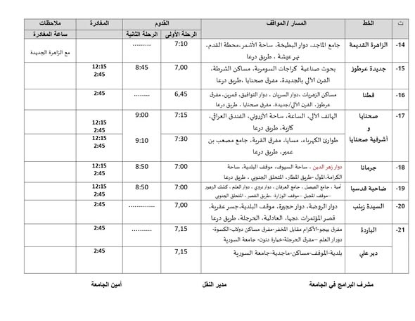 يحدد دوام الجامعة السورية الخاصة في شهر رمضان المبارك من الساعة 8:00 صباحاً وحتى الساعة 2:45... بناءً عليه تم وضع برنامج النقل.